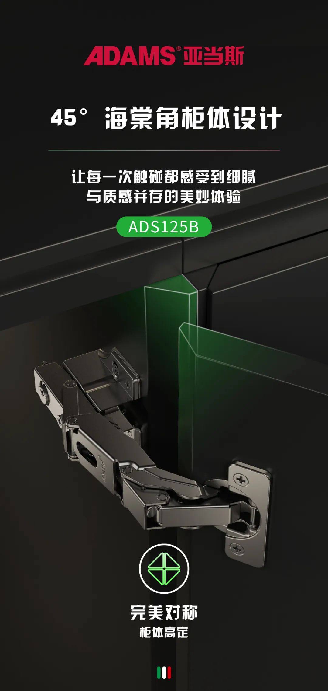 亞當(dāng)斯ADS125系列鉸鏈適用范圍廣。裝在海棠角門柜上,讓柜體門邊更美觀,開門角度更大,取物更方便,時(shí)下流行的骨骼門柜也能裝。