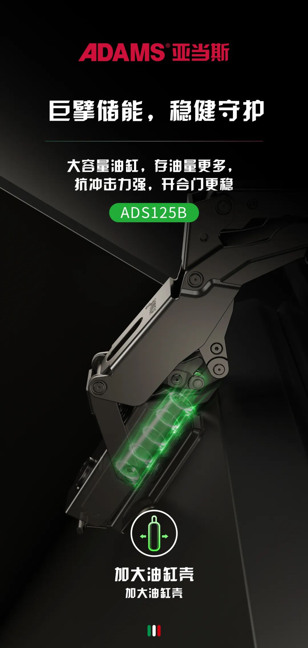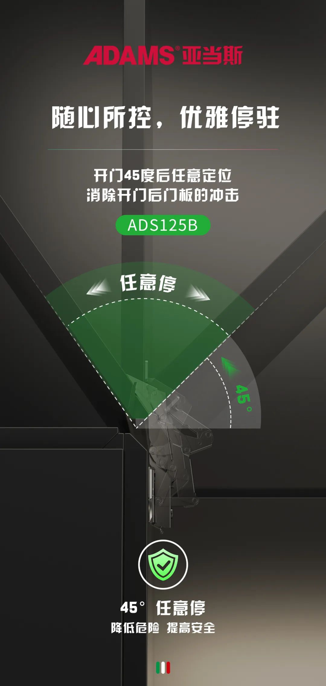 亞當(dāng)斯ADS125系列鉸鏈具有任意定位功能,打開柜門到45°后,任意角度都能停下,不會(huì)出現(xiàn)門板大力撞向墻壁或柜邊物品的情況,為每個(gè)家庭帶來實(shí)實(shí)在在的安全感。