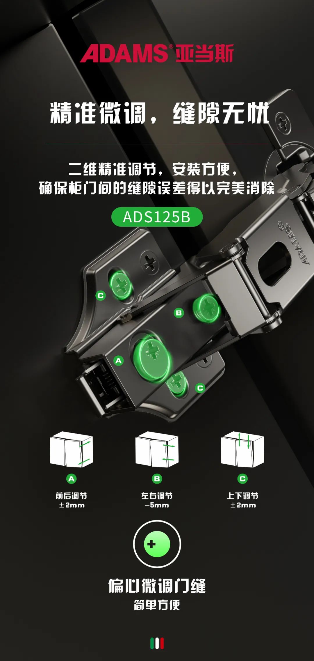 剛安裝上柜門時(shí)不平整?沒關(guān)系,無需拆卸再重新安裝,根據(jù)需求進(jìn)行上下、左右、前后門縫調(diào)節(jié)即可,操作簡單,小白也能全掌握。
