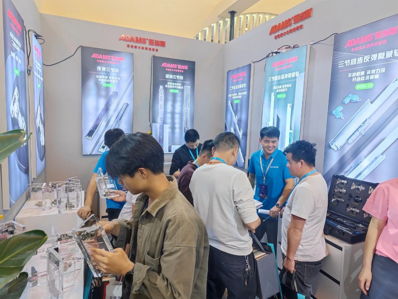 亞當斯的展位上陳列了各式各樣的鉸鏈、滑軌等明星產品,其中GM一字鉸鏈、GS18A鉸鏈、MD03三節隱藏滑軌等產品吸引眾多的觀眾咨詢和體驗,成為展位的焦點之一。不少專業觀眾表示:“亞當斯五金產品簡約時尚,性能卓越,能為家居生活添磚加瓦,提升了家居的實用性和美觀度。”