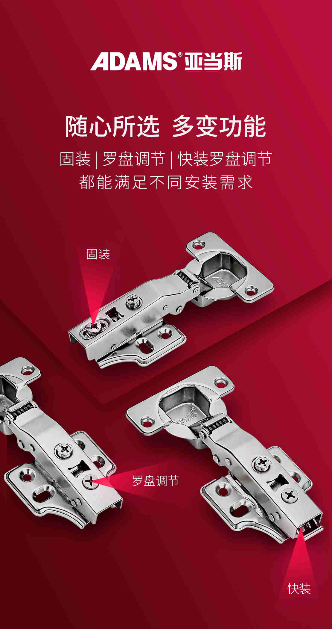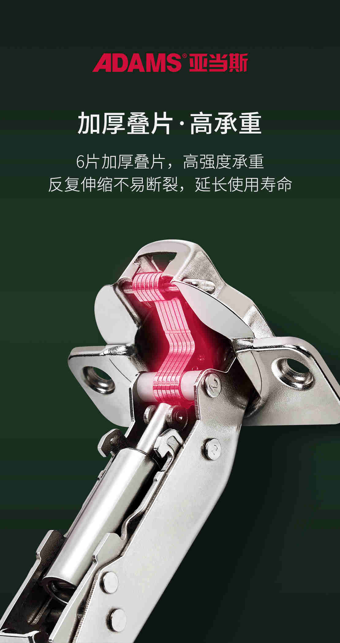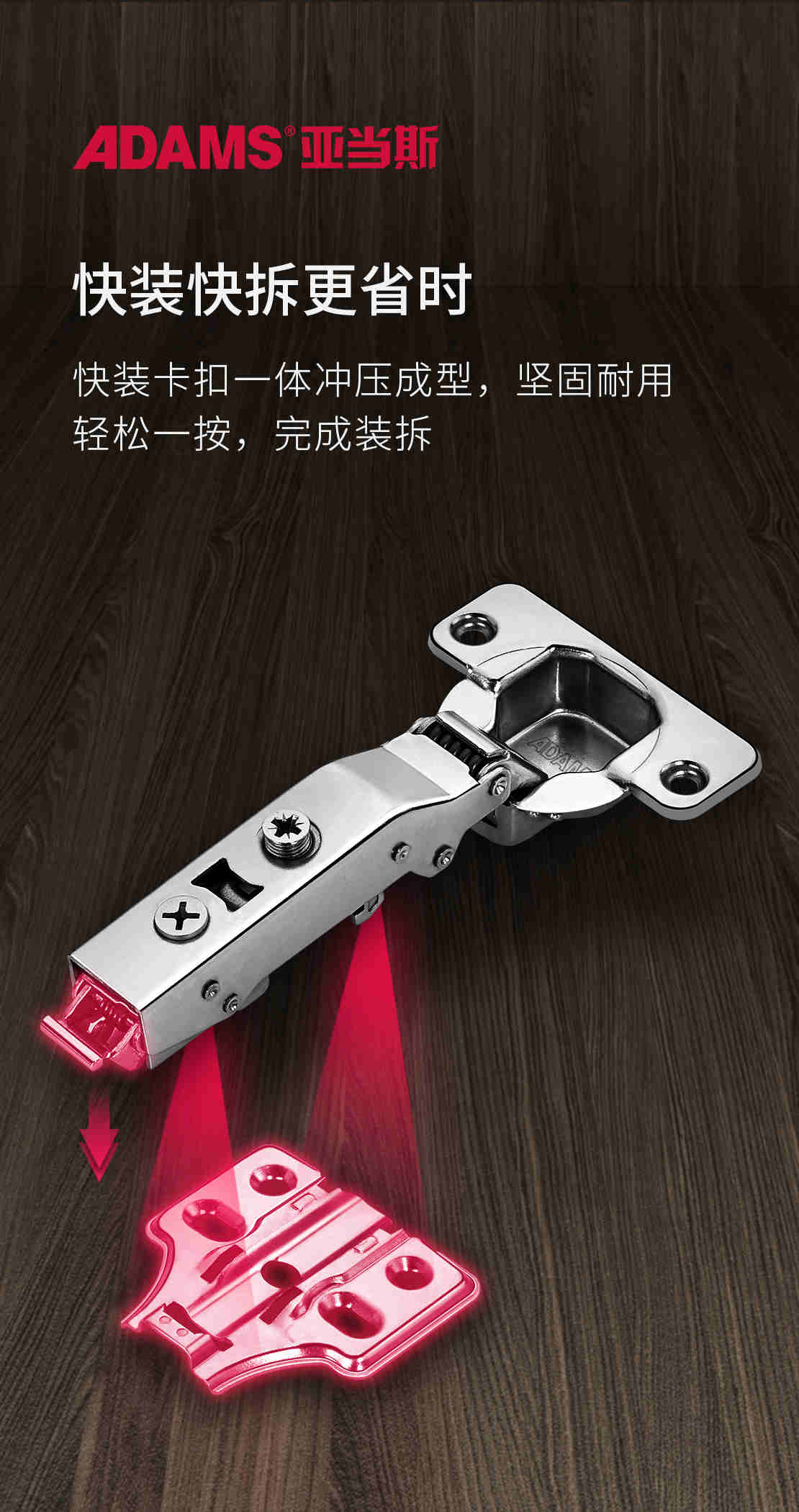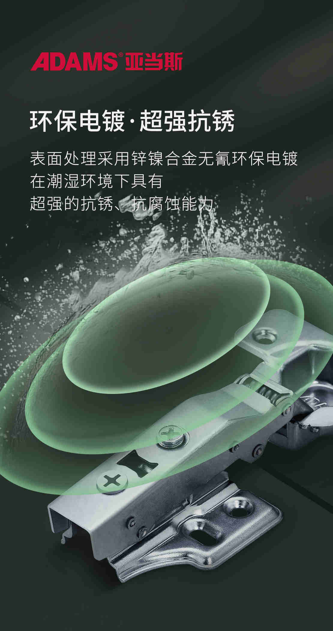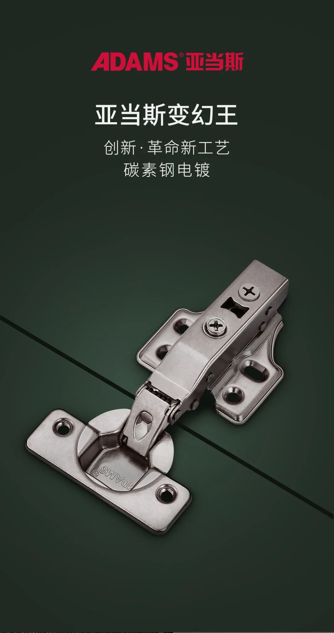 亞當斯變幻王各組成零件之間切合緊密,不易產生松動,鉸鏈表面經過中性鹽霧測試168小時,酸性測試24小時,開合壽命40000次,一開一關之間手感更輕巧。