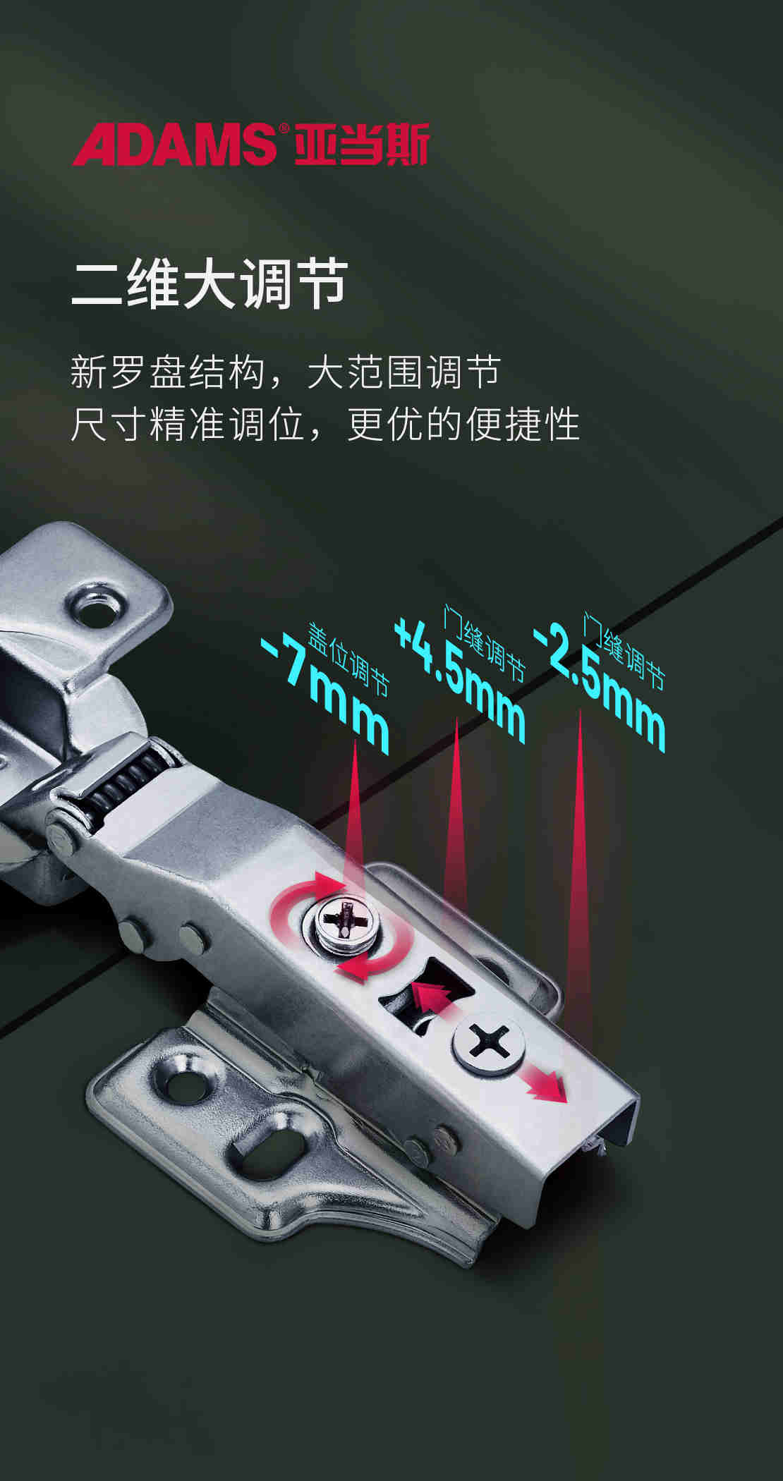 亞當斯變幻王再次突破界限,在安裝時間上更快,直接轉動尾部的調節羅盤即可實現門的前后調節,省時省力,比傳統安裝速度快五倍以上,調節能力大大提升。相較于市面上二維調節鉸鏈的前后合計調節4mm,變幻王前可調節4.5mm、 后可調節2.5mm,前后合計調節量達7mm;底座安裝距離超越國際標準37mm,可調空間更大,不受限制、高效便捷。