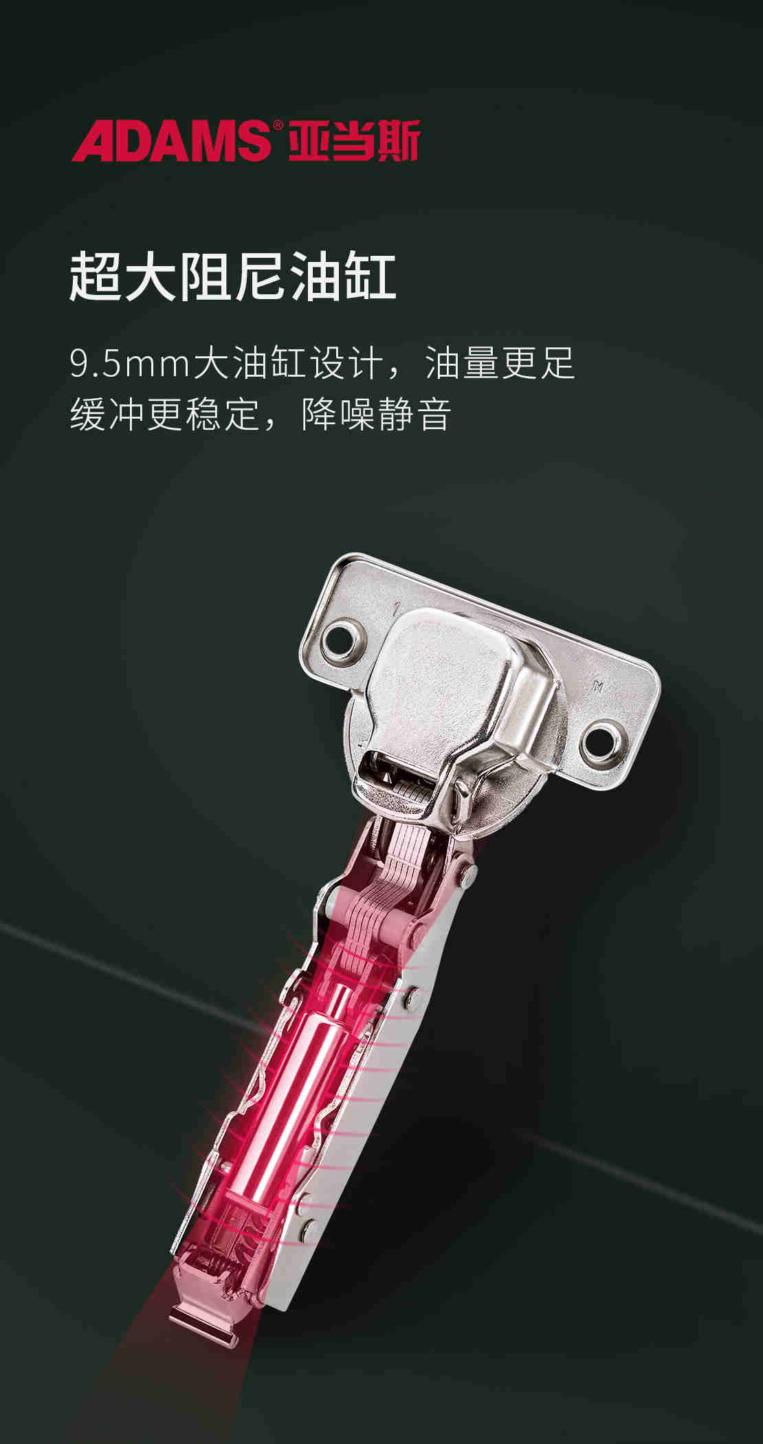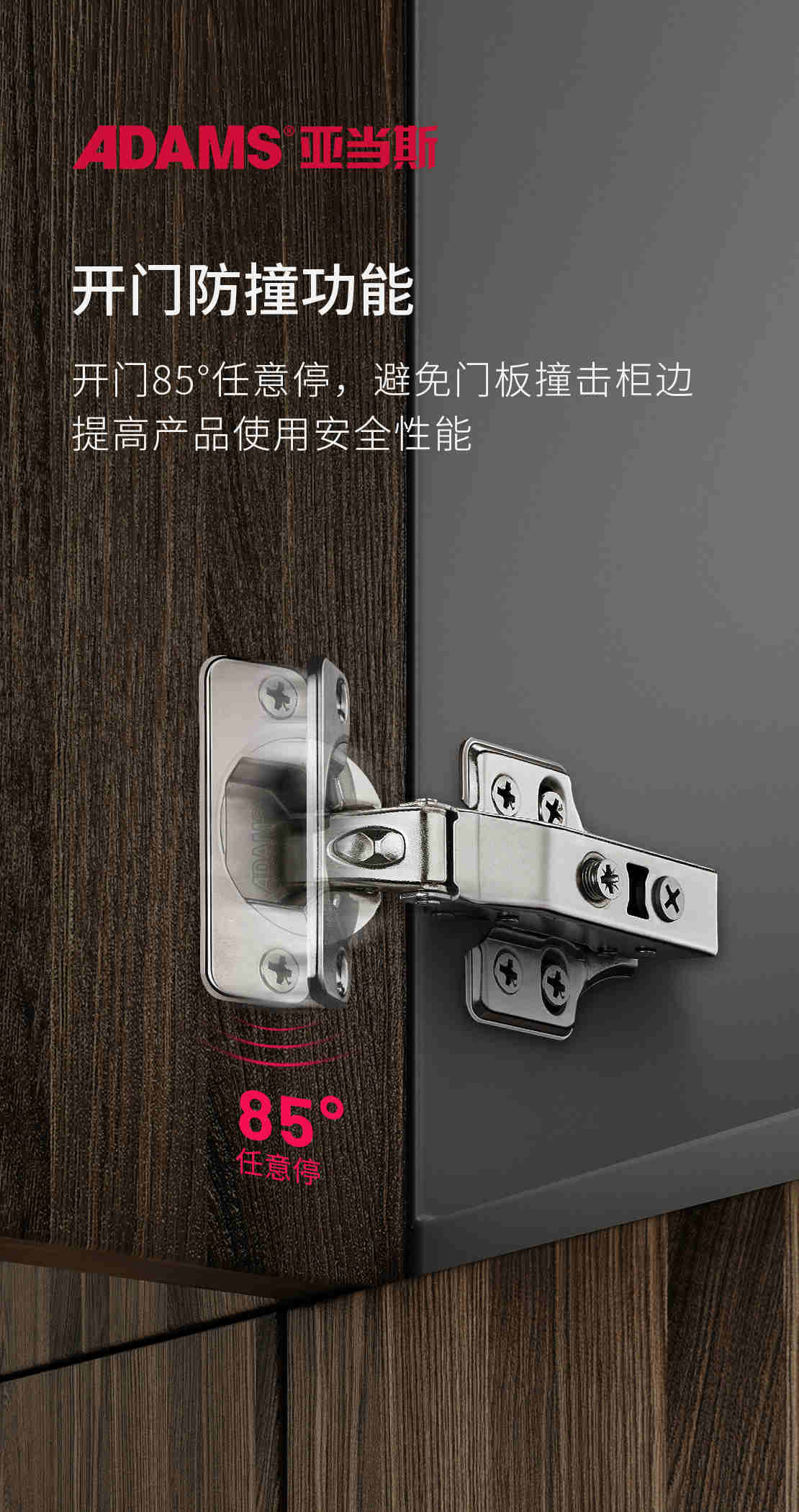 亞當斯變幻王在設計上更具人性化,開門85°隨意停下,15°小角度緩沖效果能有效防止“被門板夾手”的情況,同時能更好地保護門板。