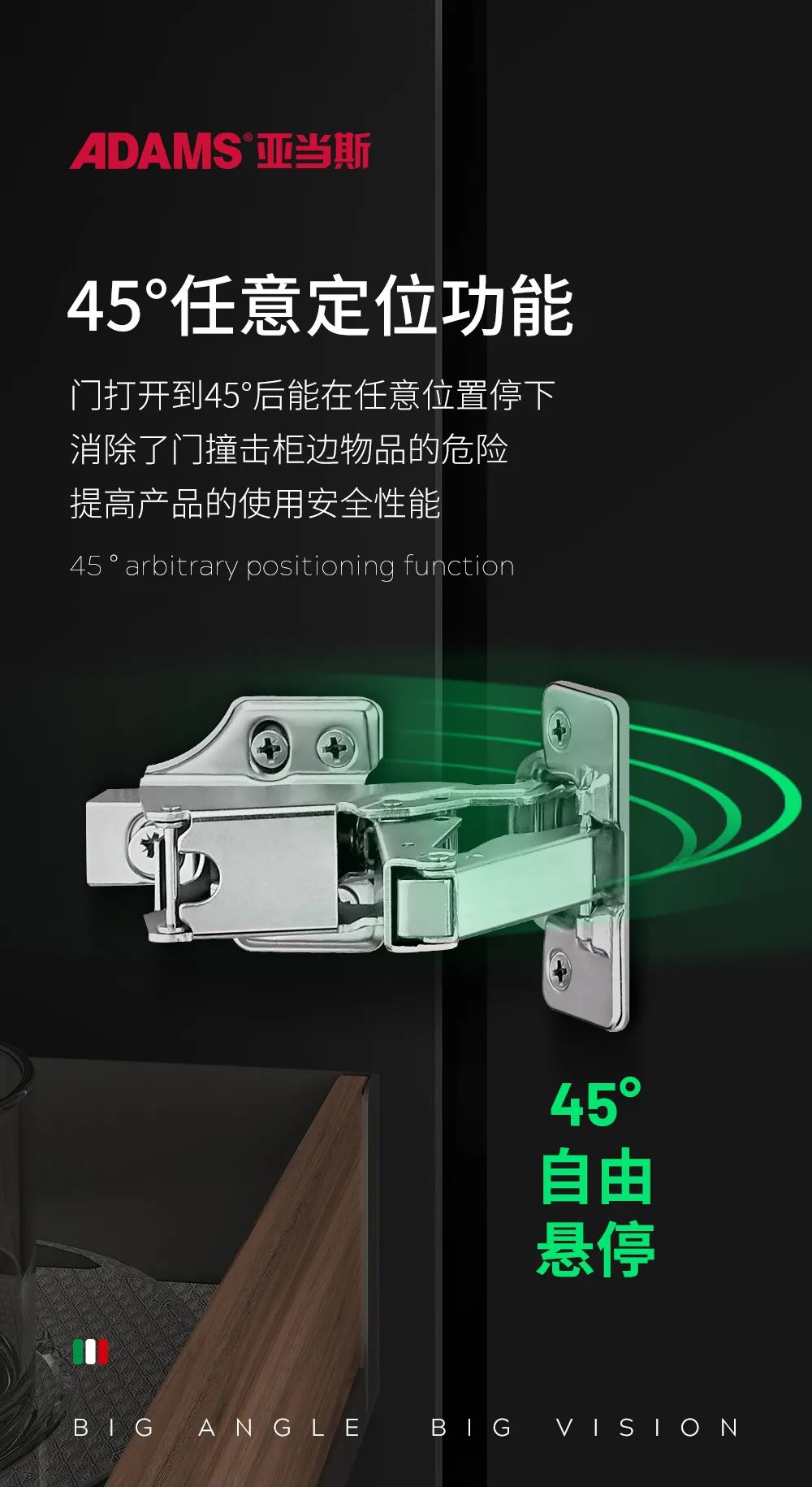 45°后自由懸停更安全,該鉸鏈為二段力任意停鉸鏈,在開啟角度大于45°后能隨意定位,成功避免門板或墻壁之間的碰撞和消除柜門撞擊柜邊物品的危險。