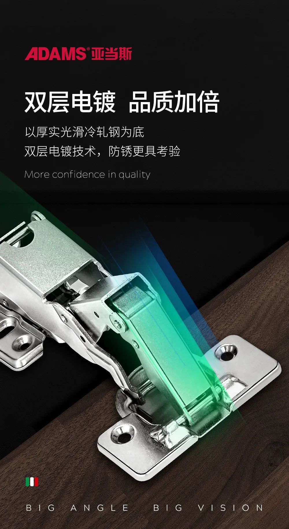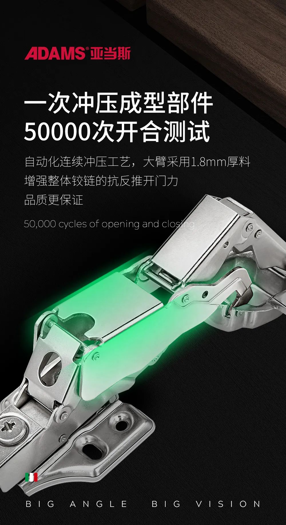 ADS165°大角度鉸鏈采用自動化連續(xù)沖壓工藝,鉸鏈部件一次沖壓成型,柜門開合次數(shù)達到5萬次,加厚大臂使用1.8mm材料,增強整體鉸鏈的抗反推開門力,外表潤滑、手感扎實。