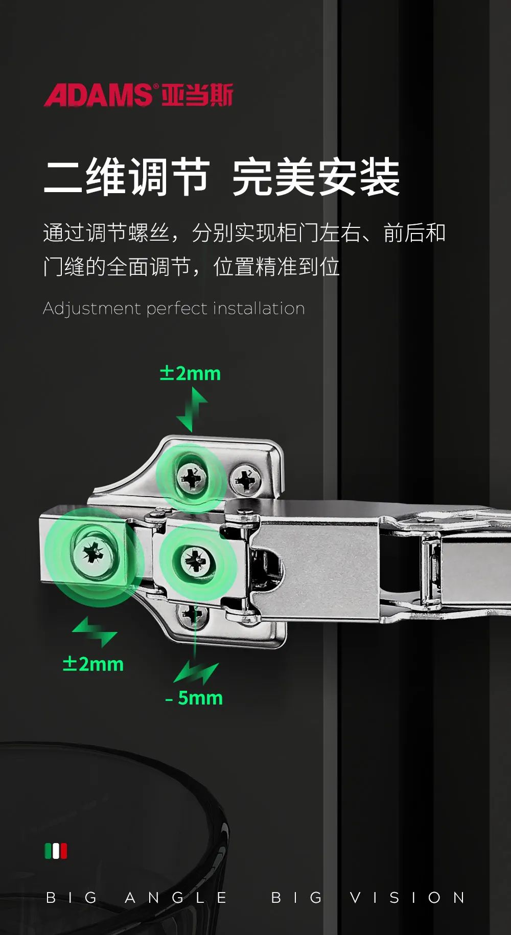 極具人性化的二維調(diào)節(jié),左右調(diào)節(jié)-5mm~±2mm,前后調(diào)節(jié)±2mm,保證了鉸鏈關節(jié)靈活性,讓柜門更嚴密、穩(wěn)定性高。