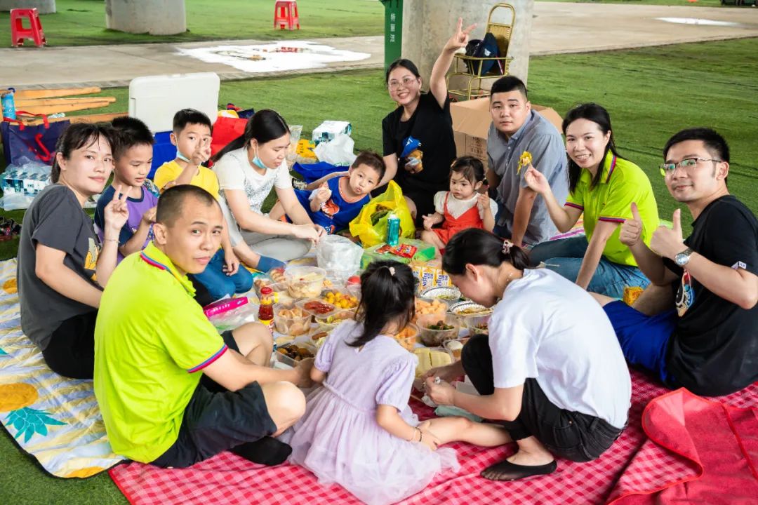 短暫的歇息后,隨著工作人員的召集,家長朋友迅速分好隊伍,開始布置野餐場地和準備食物。戶外野餐能感受別樣快樂的同時也培養了孩子們勞動、自理能力。在白云與草坪下,孩子們參與其中,樂不思蜀。