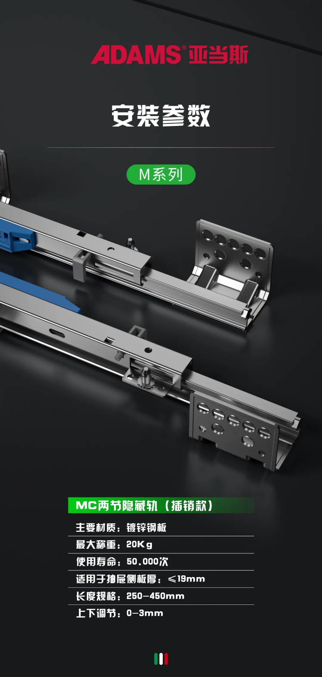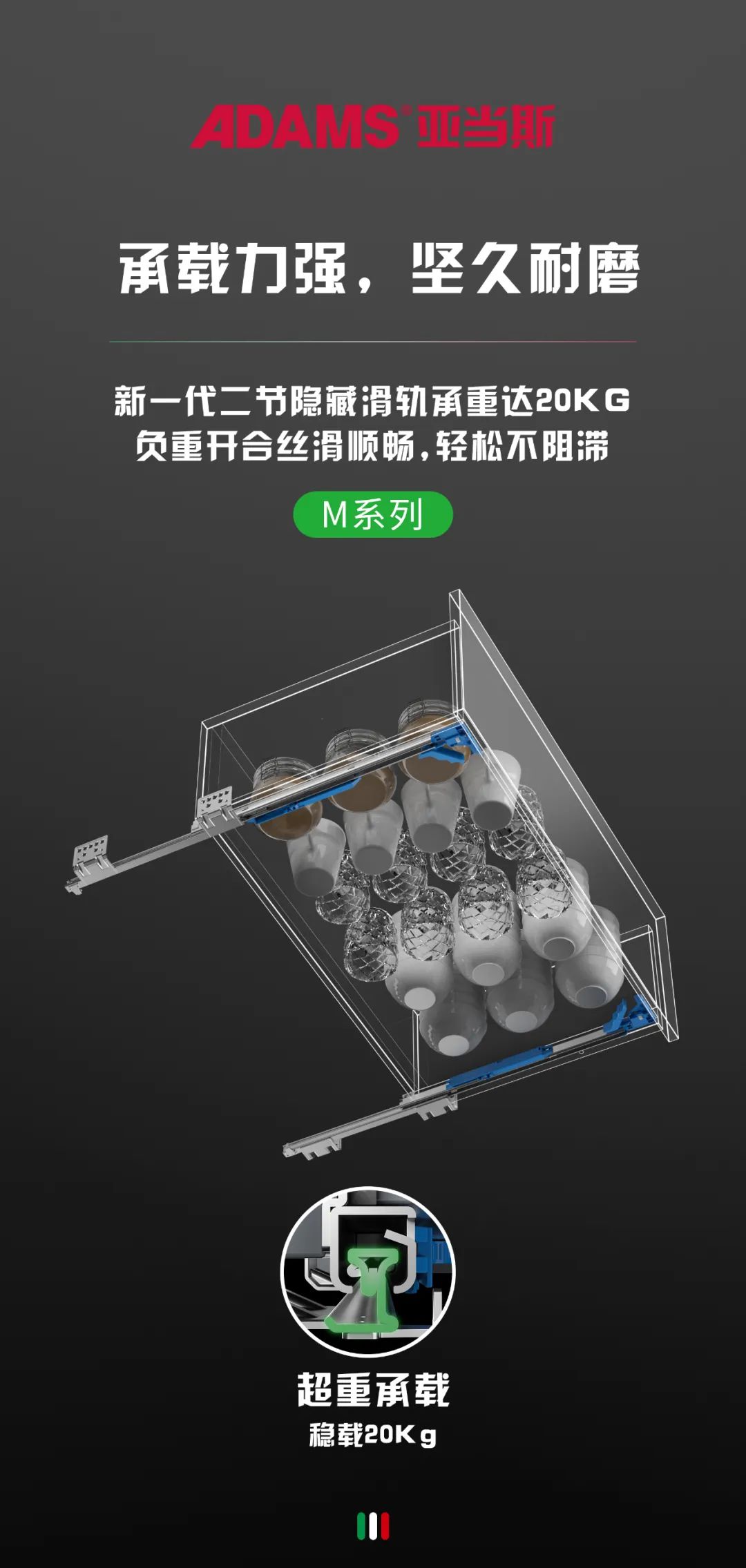美好生活由此開(kāi)啟,負(fù)重推拉不費(fèi)力,亞當(dāng)斯M系列二節(jié)隱藏軌能承重達(dá)20kg,平穩(wěn)堅(jiān)固。