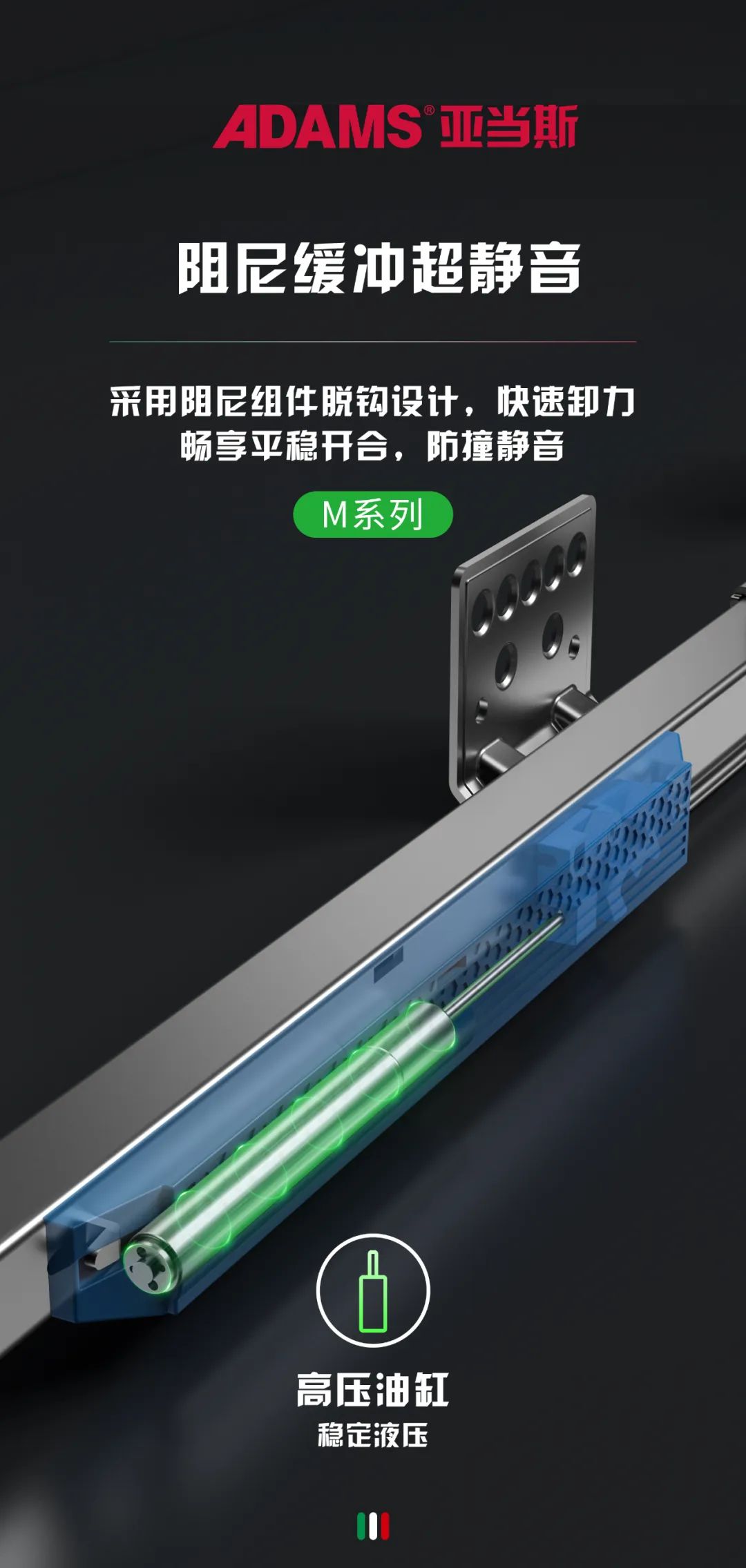 亞當(dāng)斯M系列二節(jié)隱藏滑軌采用高壓油缸、阻尼組件脫鉤設(shè)計(jì),運(yùn)動(dòng)過(guò)程緩沖卸力,防撞耐用兼平穩(wěn)、無(wú)懼卡頓。