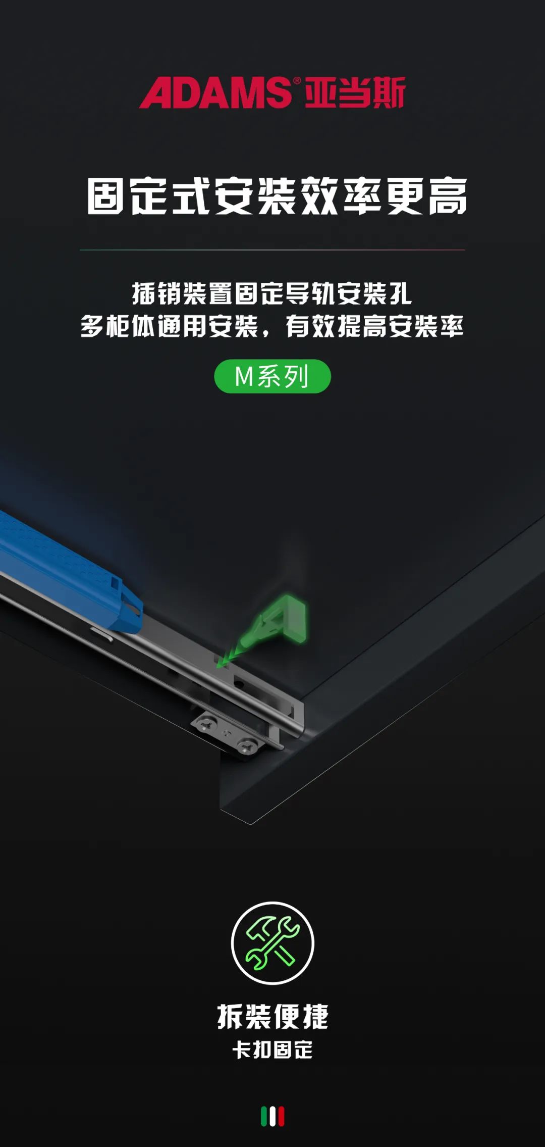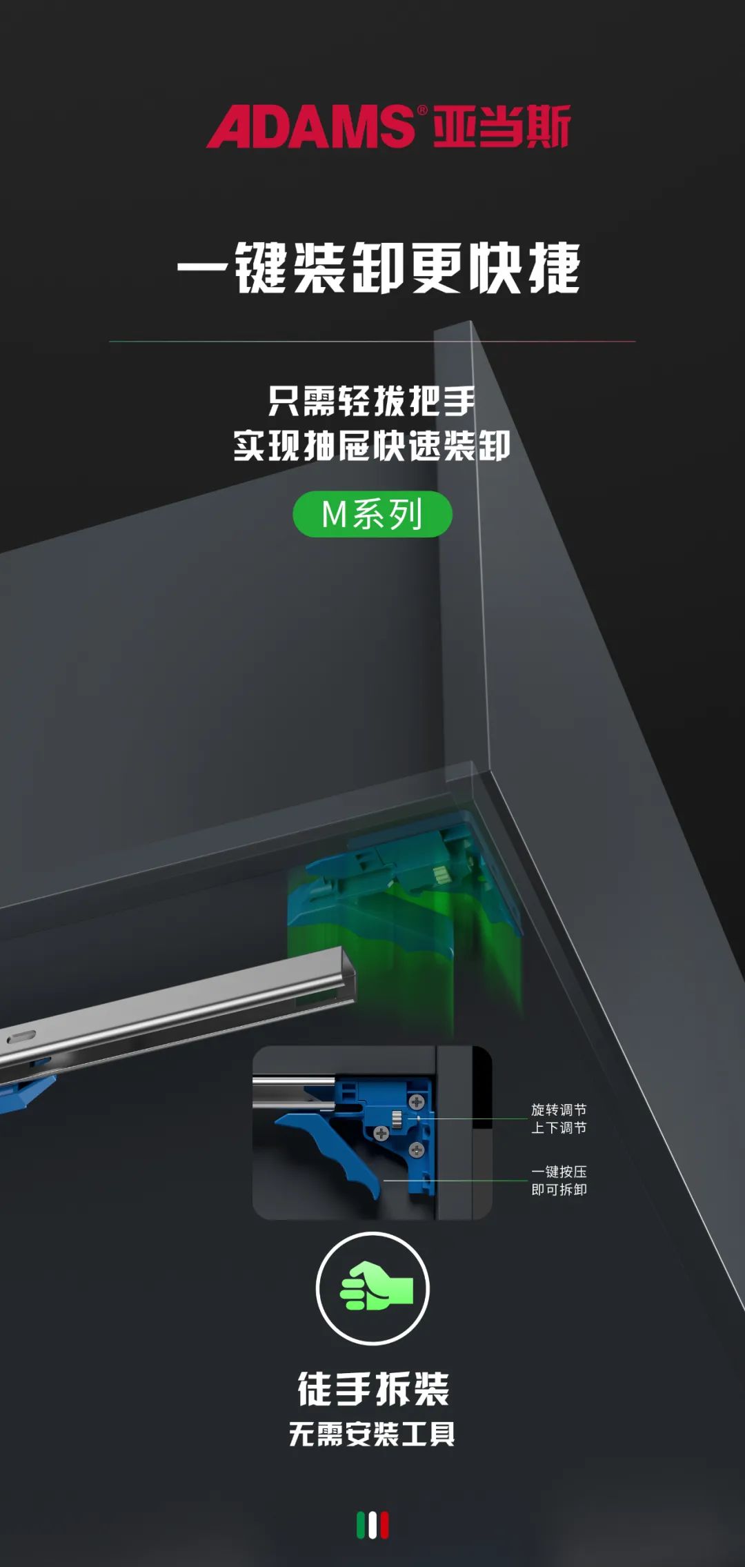 亞當(dāng)斯M系列二節(jié)隱藏滑軌分為:把手款和插銷款,根據(jù)家具安裝需求選擇最佳的抽屜搭檔即可,適配多種柜體,裝卸簡(jiǎn)單省時(shí)提效。