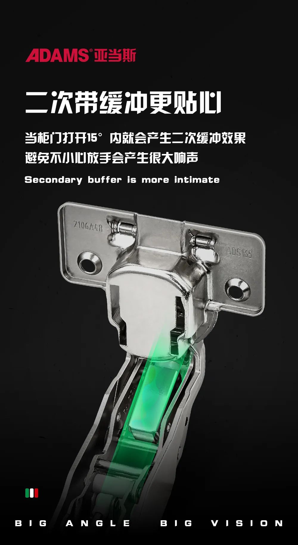 15°小角度開(kāi)啟二次緩沖功能,讓柜門(mén)輕柔無(wú)聲地開(kāi)啟閉合,更好地保護(hù)柜門(mén),同時(shí)有效避免發(fā)生意外夾手等狀況。