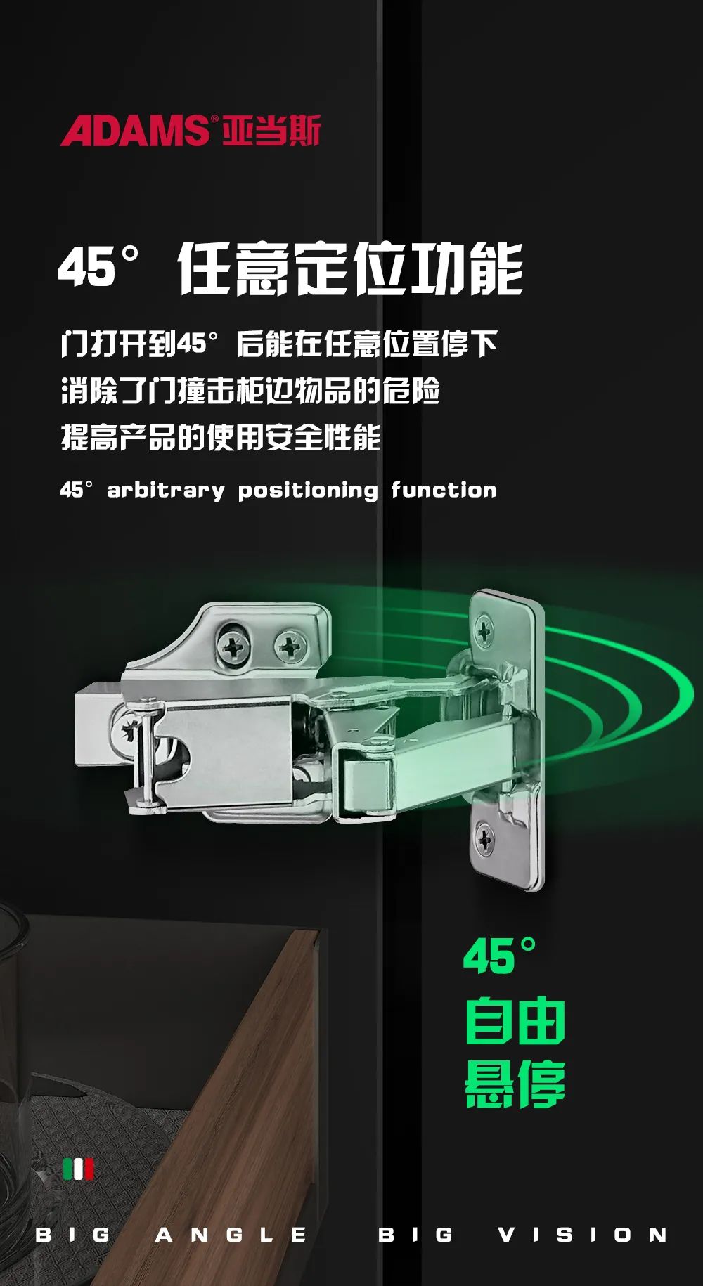 45°后自由懸停更安全,該鉸鏈為二段力任意停鉸鏈,在開(kāi)啟角度大于45°后能隨意定位,成功避免門(mén)板或墻壁之間的碰撞和消除柜門(mén)撞擊柜邊物品的危險(xiǎn)。