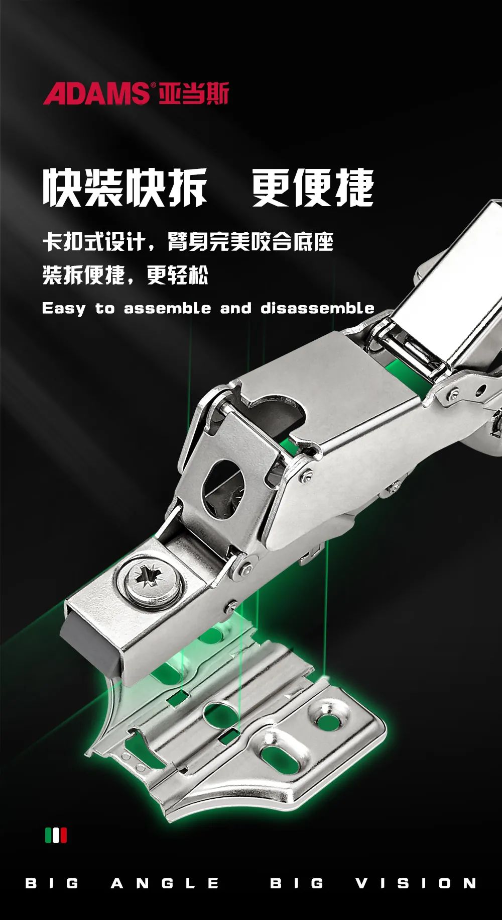 櫥柜轉(zhuǎn)角位是家里最常見(jiàn)的空間之一,如何令轉(zhuǎn)角處開(kāi)啟空間最大化?快更換上亞當(dāng)斯165°大角度鉸鏈,使用壽命長(zhǎng),又滿足家庭收納需求。