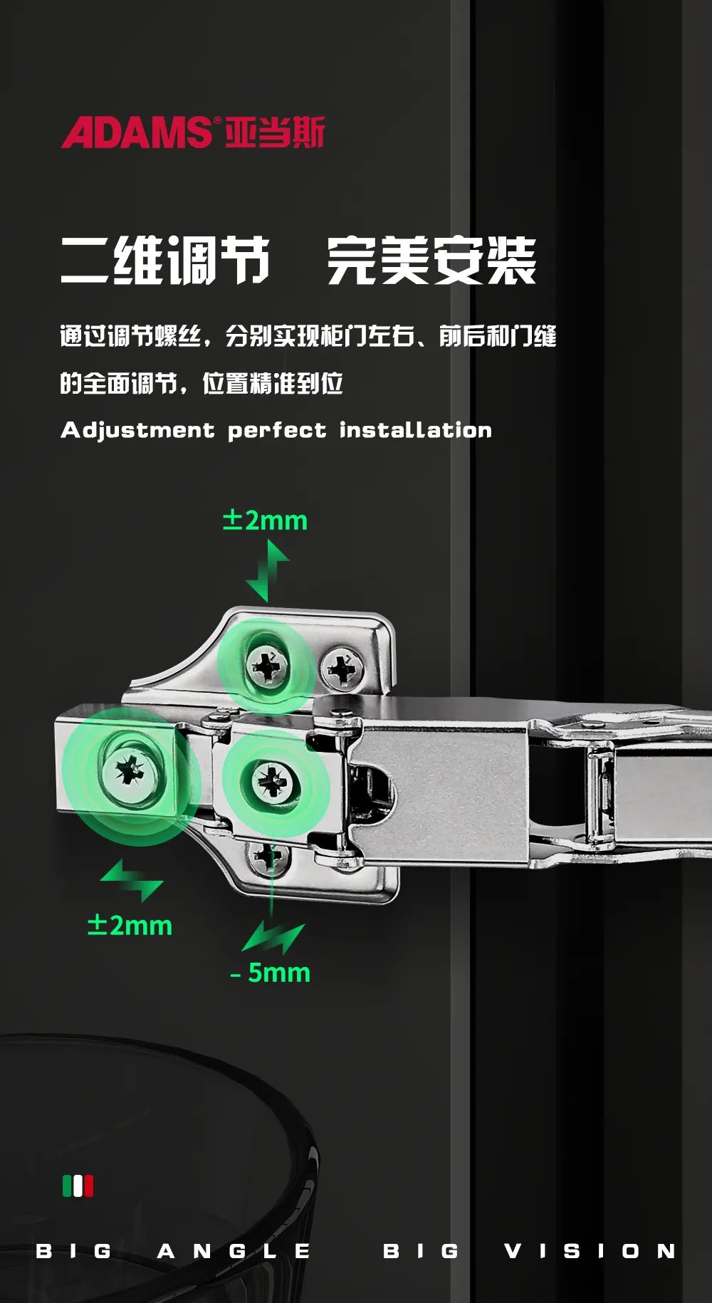 極具人性化的二維調(diào)節(jié)設(shè)計(jì),左右調(diào)節(jié)-5mm~±2mm,前后調(diào)節(jié)±2mm,保證了鉸鏈關(guān)節(jié)靈活性,讓柜門(mén)更嚴(yán)密、穩(wěn)定性高。