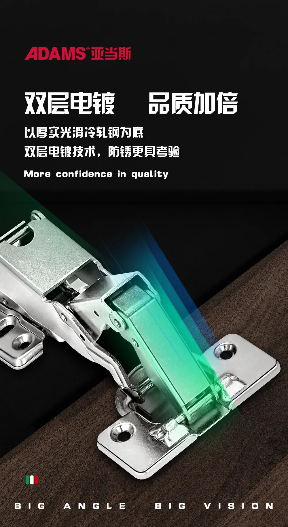 ADS165°大角度鉸鏈采用自動(dòng)化連續(xù)沖壓工藝,鉸鏈部件一次沖壓成型,柜門(mén)開(kāi)合次數(shù)達(dá)到5萬(wàn)次,增強(qiáng)整體鉸鏈的抗反推開(kāi)門(mén)力,外表潤(rùn)滑、手感扎實(shí)。